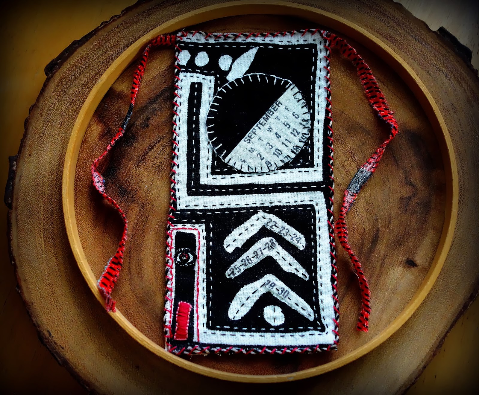 The September moon cloth was finished just in time for today's new moon in Libra. It's the tenth little full moon cloth in a series of 13 full moons, my sewing ritual for this year. Each cloth has a full moon, a house with an eye, and a calendar cloth component -- to be completed by the following new moon. Sometimes I barely make my own deadline. This piece kept getting complicated, there was a lot of tearing out and a lot of sighing. Finally I decided to not worry about adding components, to just let the background cloth be the focus. Simple does not always mean easy.