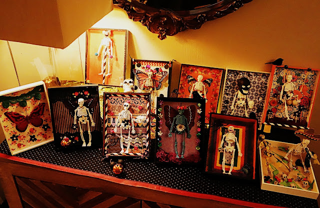 Eleven of us made little wooden shrines decorated with paper, paint, moss, sequins, butterfly wings, skeletons & skulls, stickers & flowers and much more. I finished glueing sequins on mine yesterday and then made a nice dandelion latte using instant dandelion bags and coconut milk. It was good.